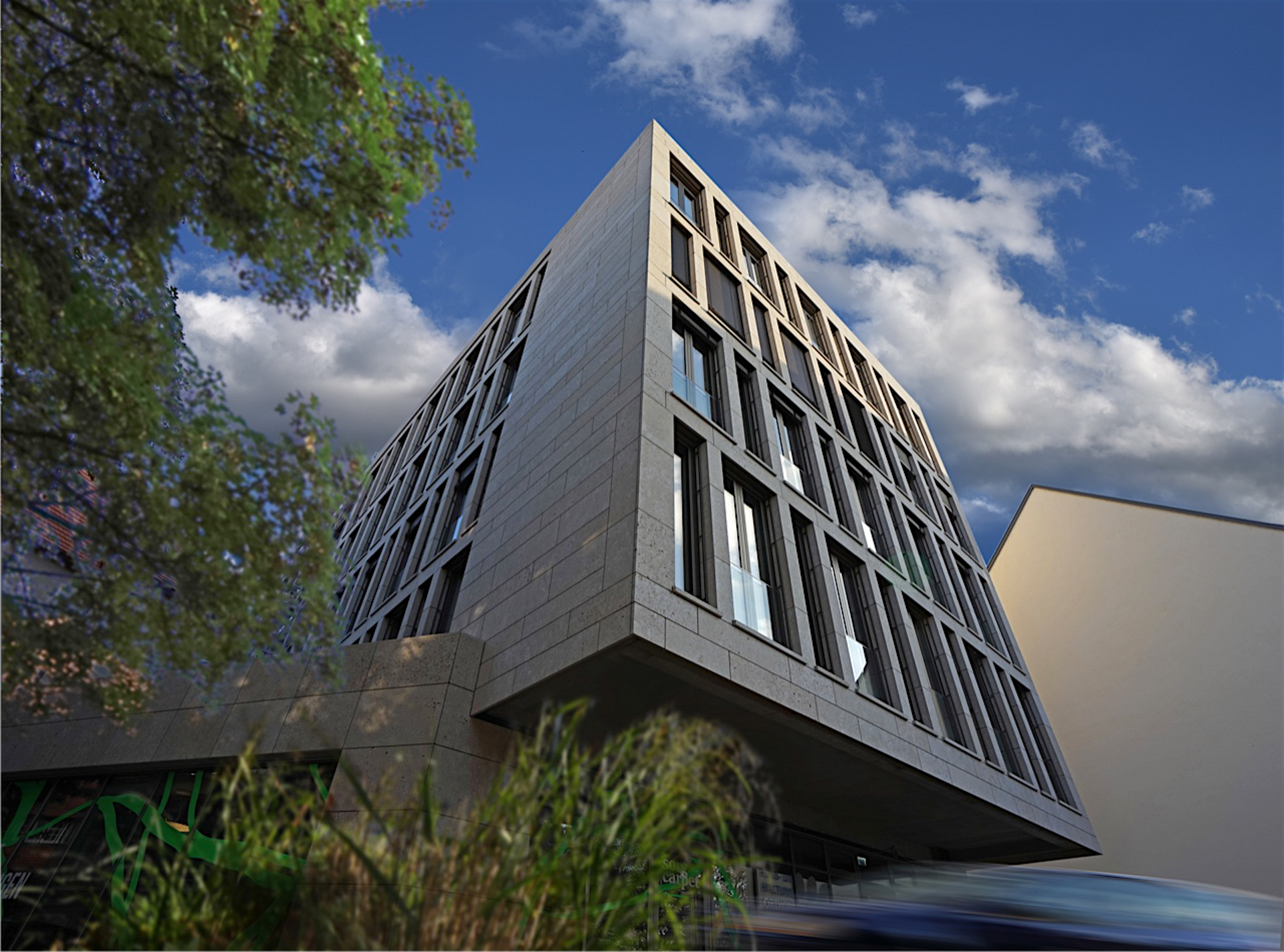 Die Umsetzung dieser hochwertigen Fassadenlösung vereinte anspruchsvolle Architektur mit technischer Präzision. Die Südseite des Gebäudes wurde mit dem bewährten Schüco FW 50+ Fassadensystem ausgestattet und mit 45 dB Schallschutzglas versehen – ideal, um störende Außengeräusche effektiv zu reduzieren und ein ruhiges, konzentriertes Arbeiten im Innenraum zu ermöglichen.