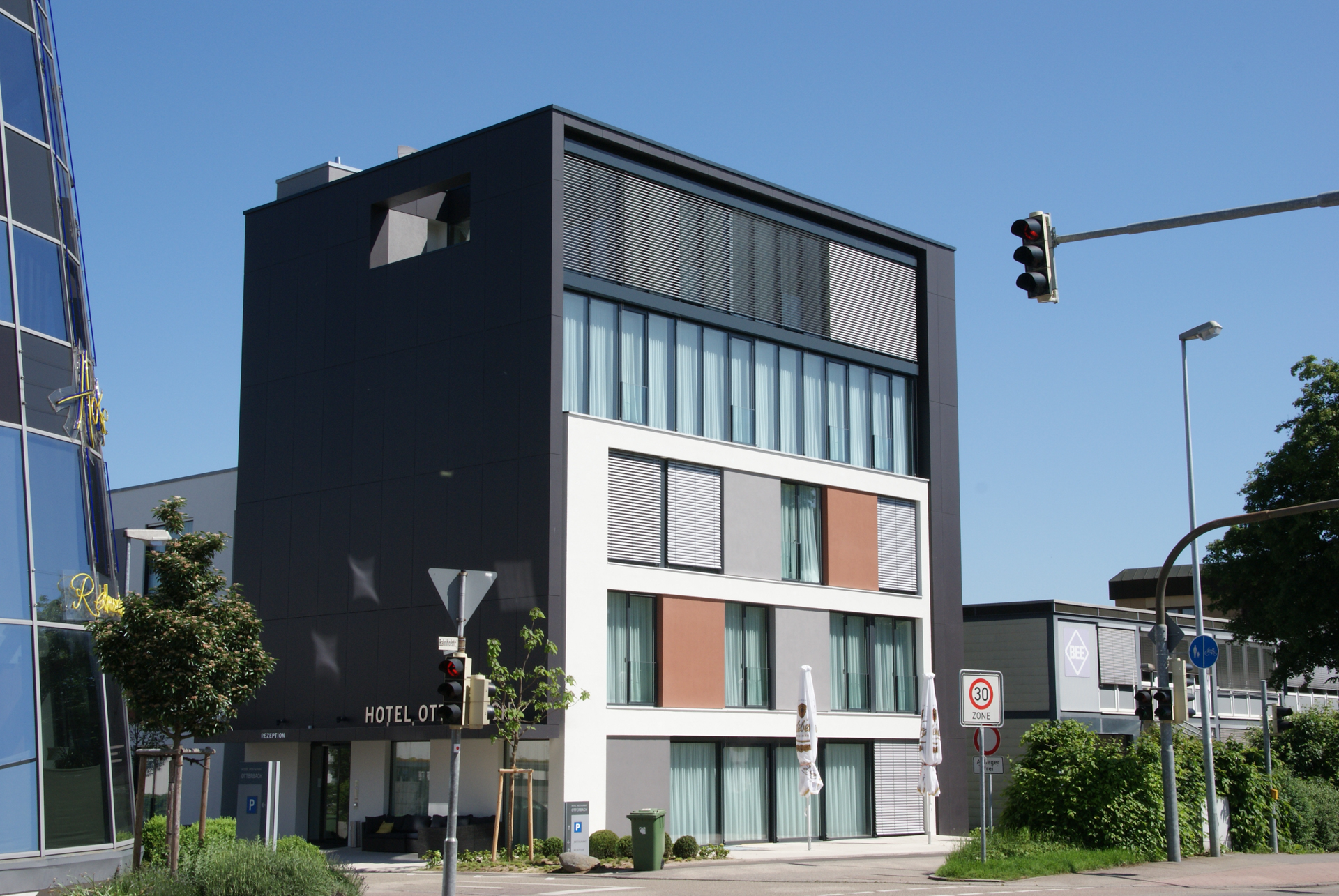Für optimalen Sonnen- und Sichtschutz wurden Rollläden und Jalousie-Anlagen in die Fassadenstruktur integriert – technisch durchdacht und optisch harmonisch.