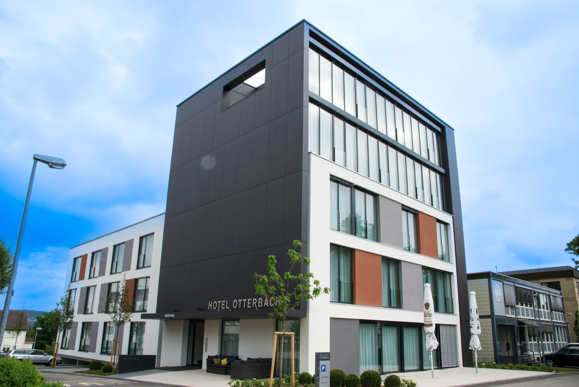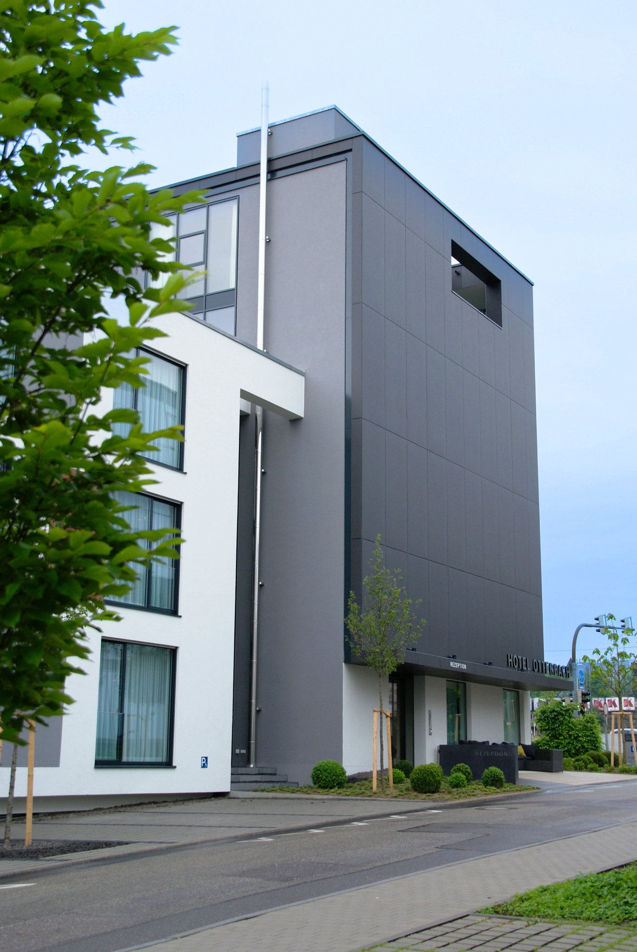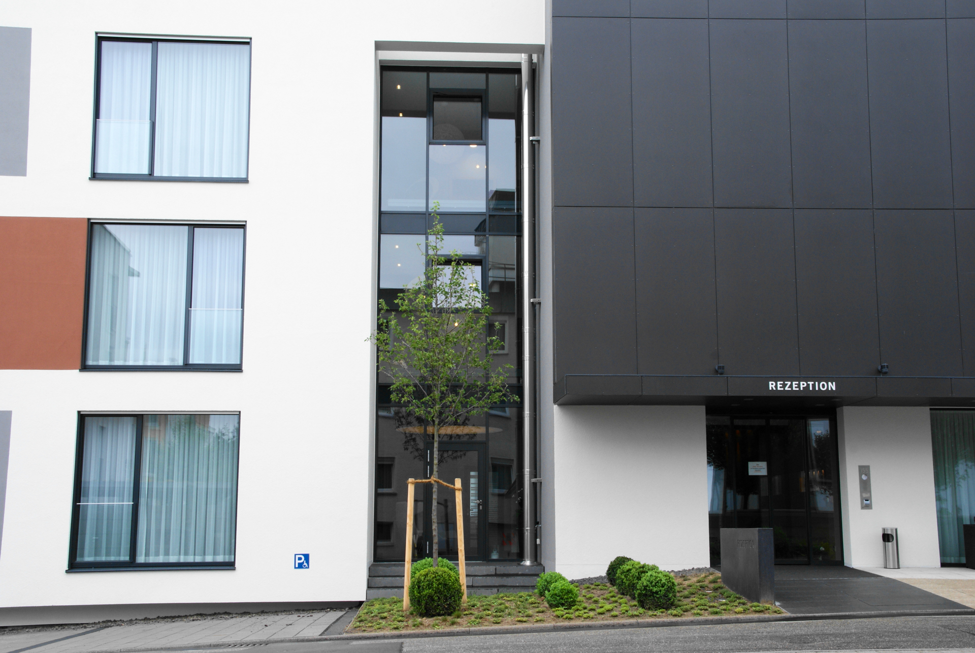 Die ergänzenden Aluminiumfenster und -türelemente wurden in Schüco AWS 75 SI Blocksystem-Ausführung ausgeführt. Dieses System überzeugt durch seine schlanke Optik, hohe Wärmedämmung und verdeckt liegende Flügelprofile, was der Fassade ein besonders ruhiges und hochwertiges Erscheinungsbild verleiht.