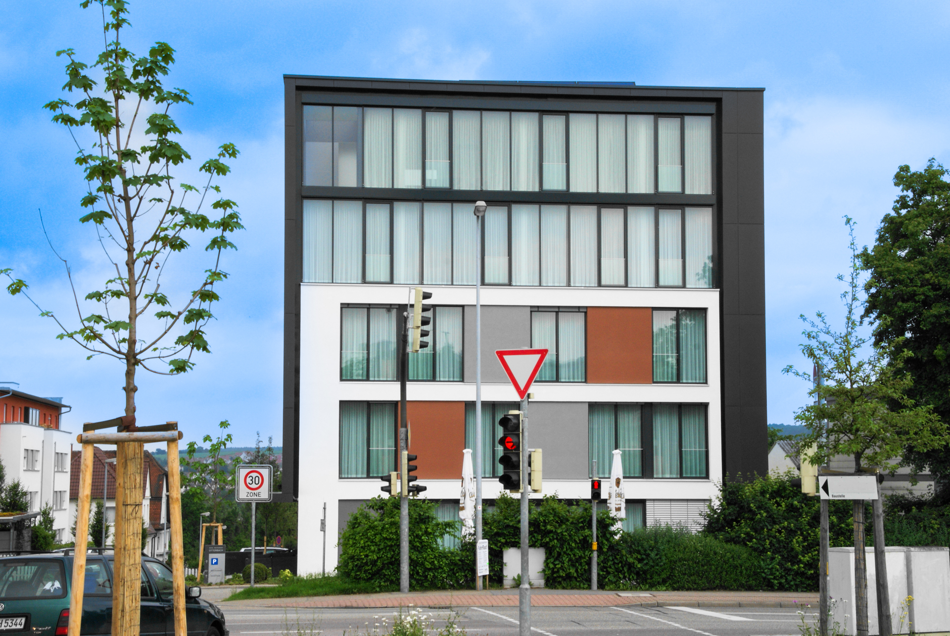 Die Südfassade dieses Gebäudes wurde mit einem modernen Schüco FW 50+ Fassadensystem realisiert, das sowohl gestalterische als auch funktionale Anforderungen auf hohem Niveau erfüllt. Zum Einsatz kam hochwertiges 45 dB Schallschutzglas, das eine spürbare Reduzierung der Lärmbelastung gewährleistet und so für ein ruhiges Raumklima sorgt – selbst bei exponierter Lage oder hohem Verkehrsaufkommen.