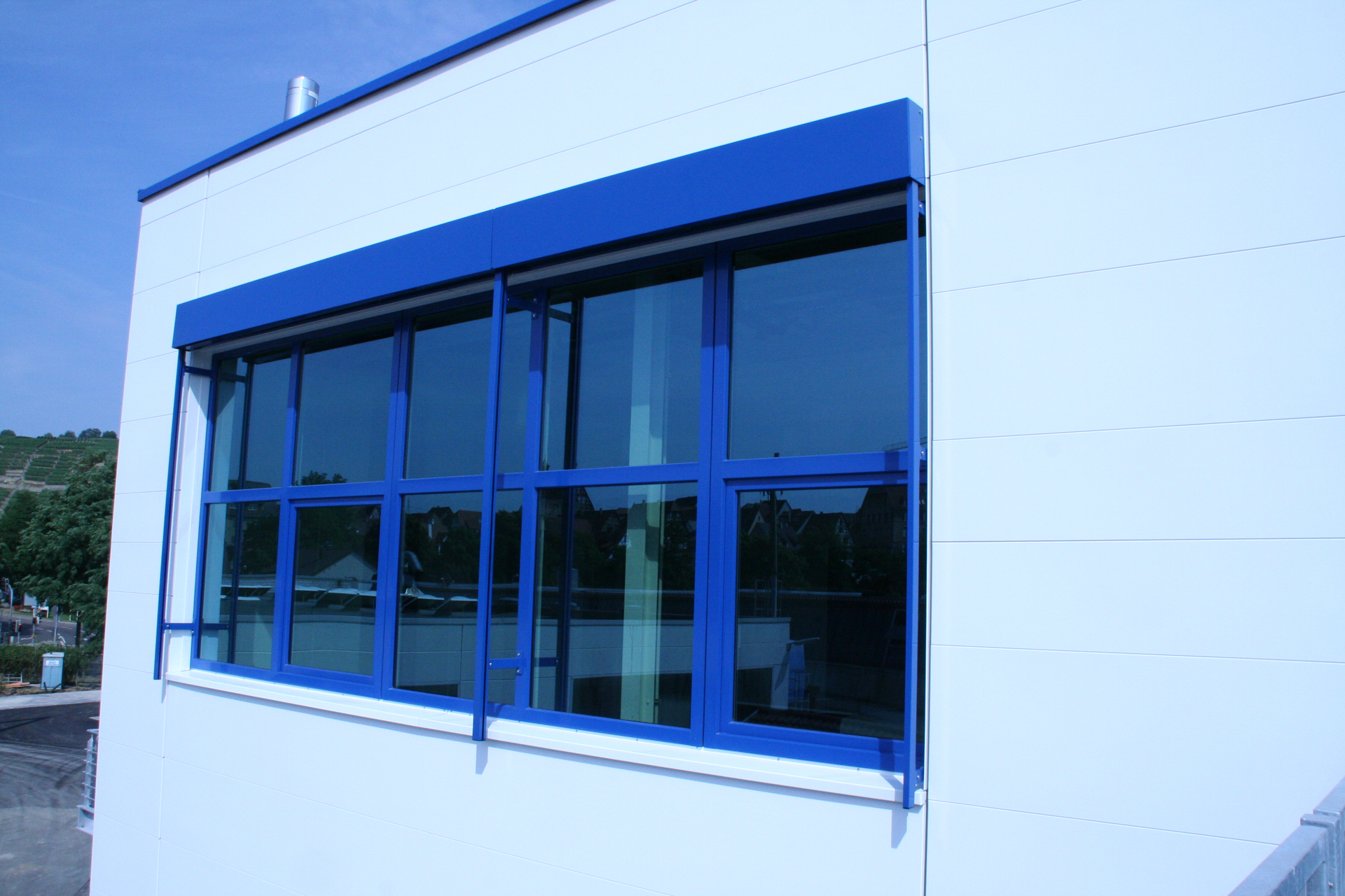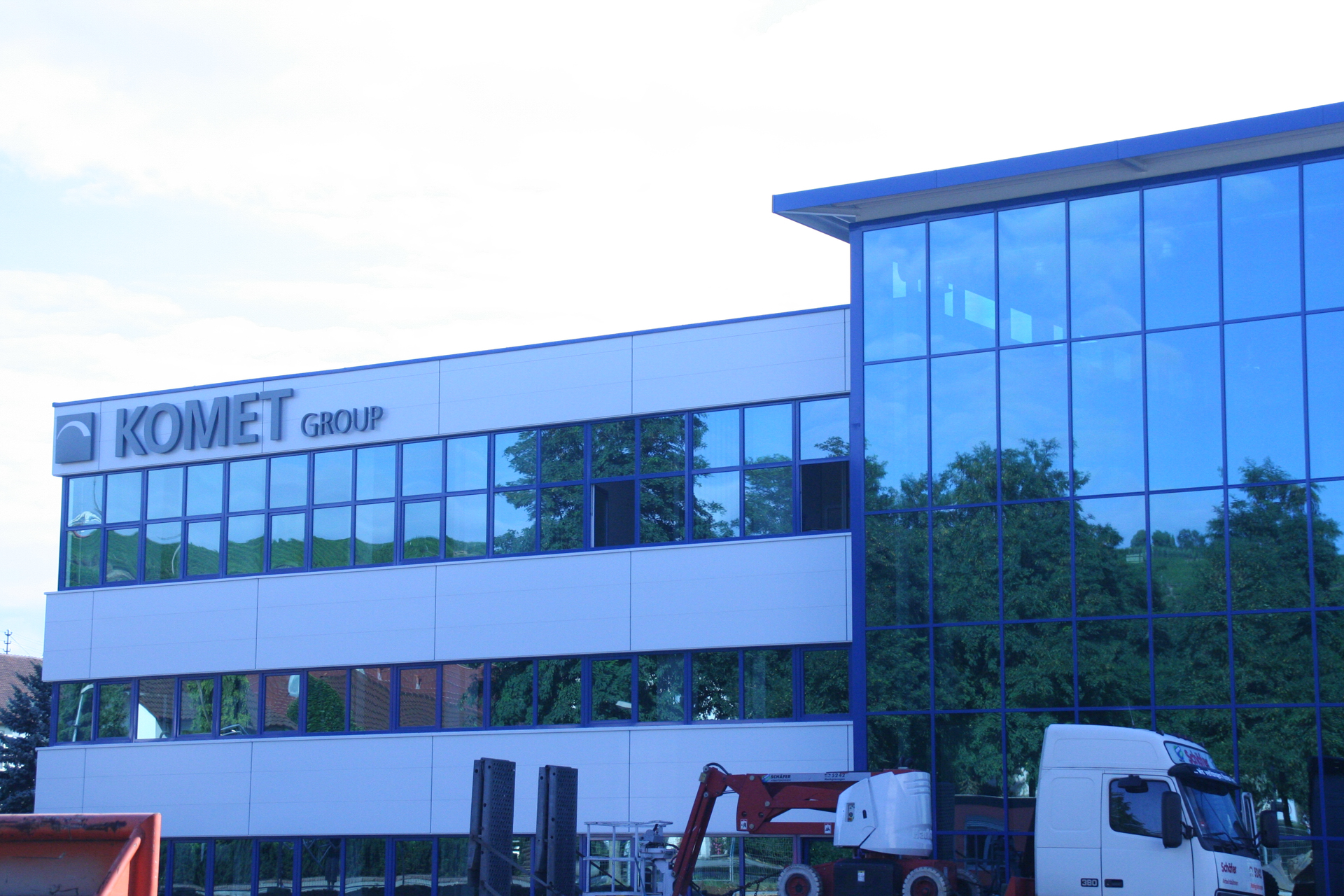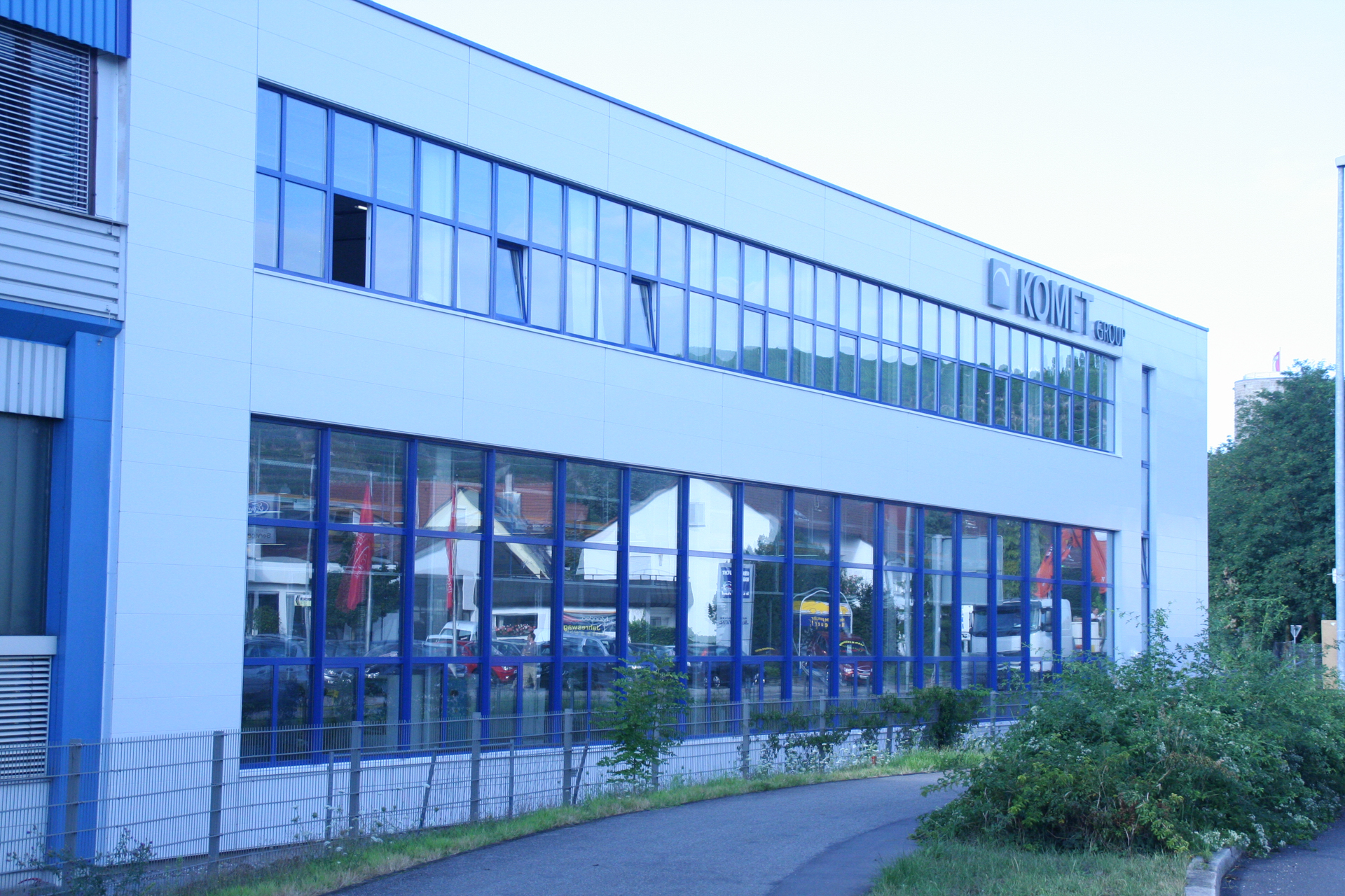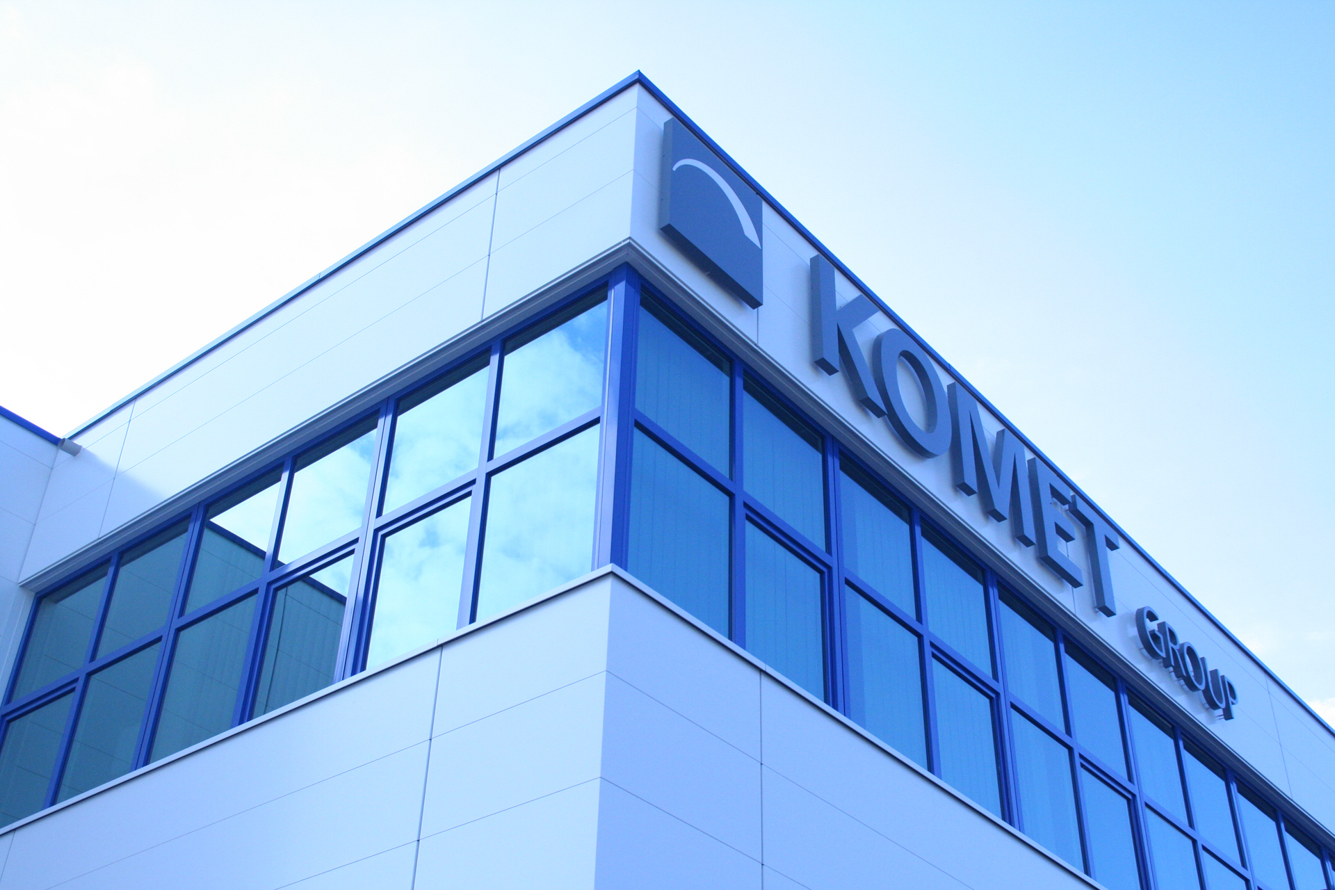 Besonderes Augenmerk lag auf der wirtschaftlichen Umsetzung im Innenbereich. So kamen kosteneffiziente Aluminiumelemente in Rahmenbauweise zum Einsatz – sowohl im Produktionsbereich des KOMET-Gebäudes als auch in den Besprechungsräumen im Dachgeschoss. Diese Lösung verbindet Funktionalität mit einem klaren, modernen Design.