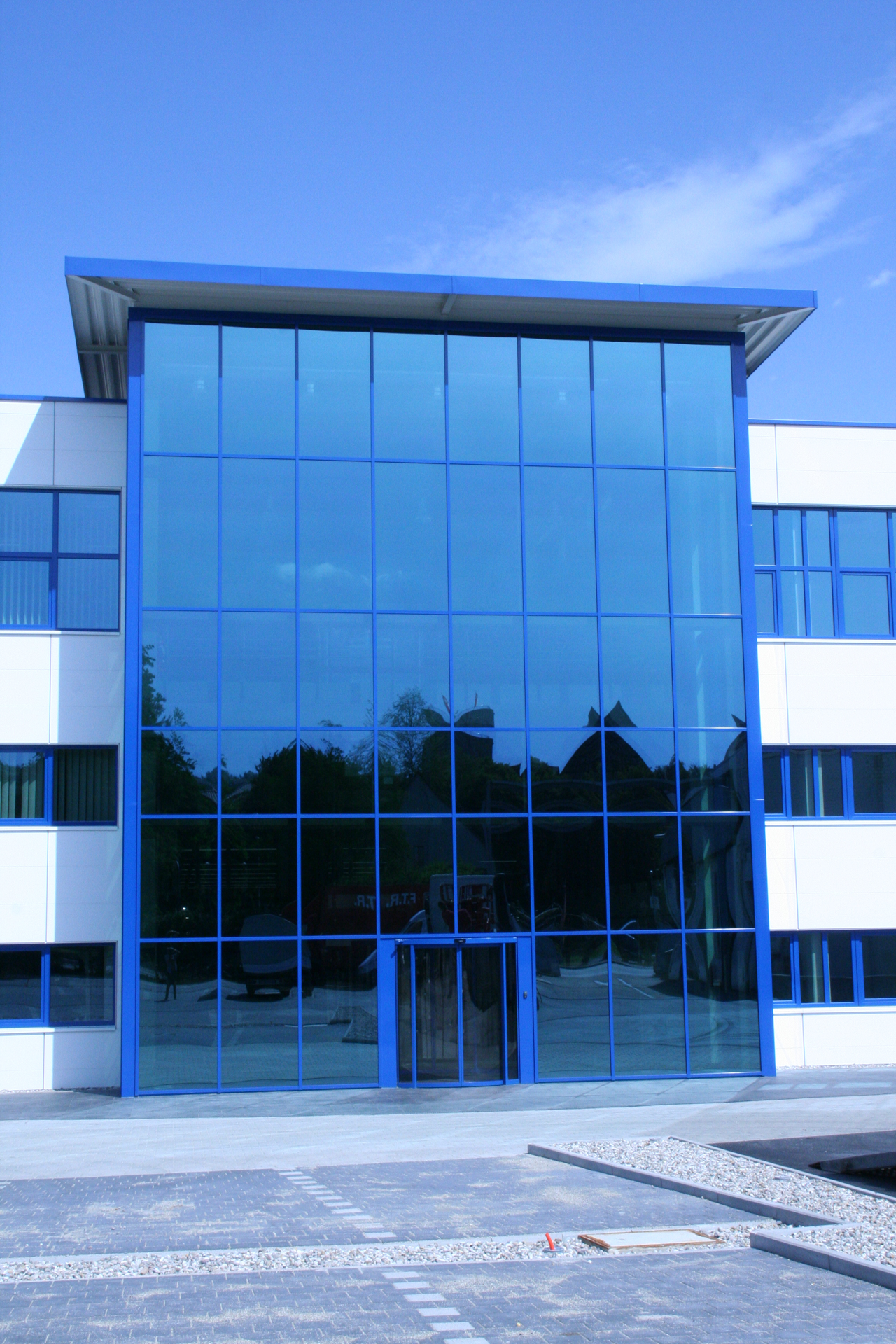 Im Rahmen eines umfangreichen Bauvorhabens entstand eine beeindruckende Glasfassade mit einer Höhe von über 12 Metern. Die Konstruktion wurde freitragend ausgeführt und durch eine eigens dafür entwickelte Stahlunterkonstruktion getragen. Verbaut wurde hochwertiges Sonnenschutz- und Wärmeschutzglas mit einem exzellenten U-Wert von 0,7, das nicht nur energetische Vorteile bietet, sondern auch für eine helle, freundliche Atmosphäre im Innenraum sorgt.